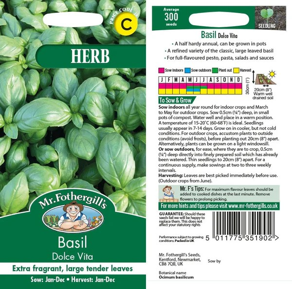 A refined variety of the classic, large-leaved basil. Plants will produce extra fragrant, large tender leaves which are ideal for making full-flavoured pesto used on pasta and salads. This new variety thrives in pots and is highly attractive.