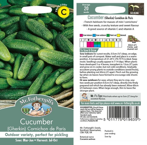Our Parisian Gherkin cucumber seeds are the perfect addition to any vegetable garden. This French heirloom vegetable seed variety, also known as Cornichon de Paris, has been a staple in Parisian markets for generations. It’s specifically grown for its small, crisp cucumbers, which are ideal for making traditional pickled gherkins. The plants are highly productive and their fruits are best harvested when they reach around 2.5cm (1 inch) in length.