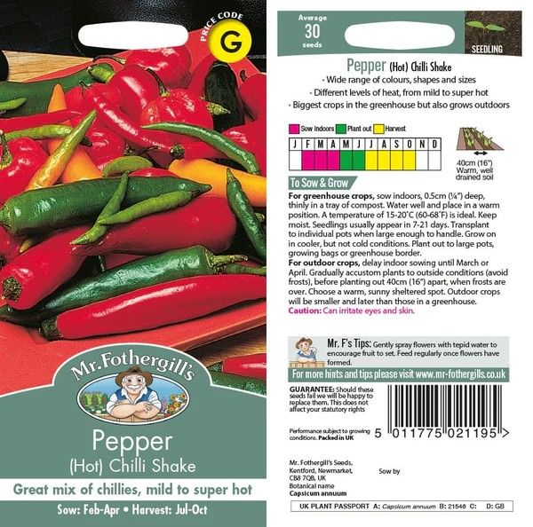A wide range of colours, shapes and sizes. Different levels of heat, from mild to super hot. The biggest crops are produced in the greenhouse but also grows well outdoors.